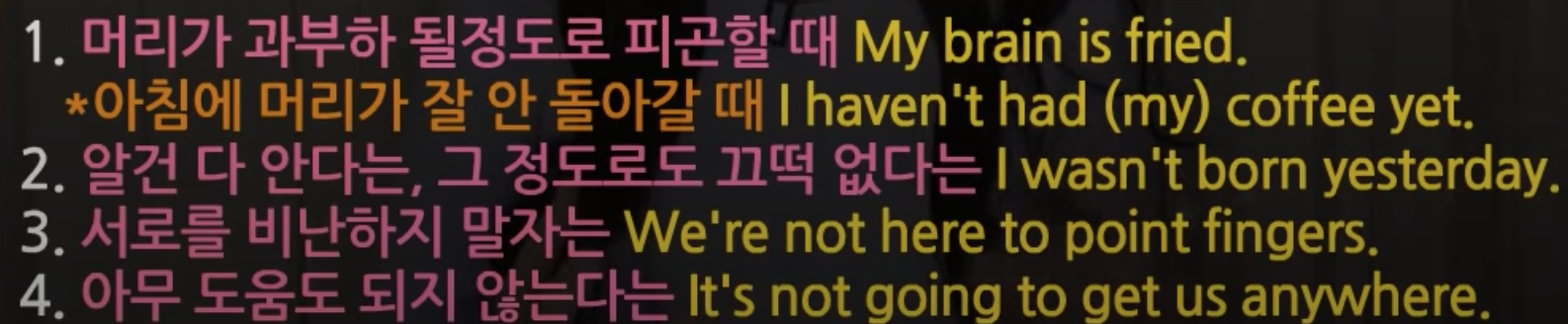 Tomorrow, maybe. My brain is a bit fried. = 내일 이야기하는 게 좋겠어요. 지금은 좀 피곤하네요.