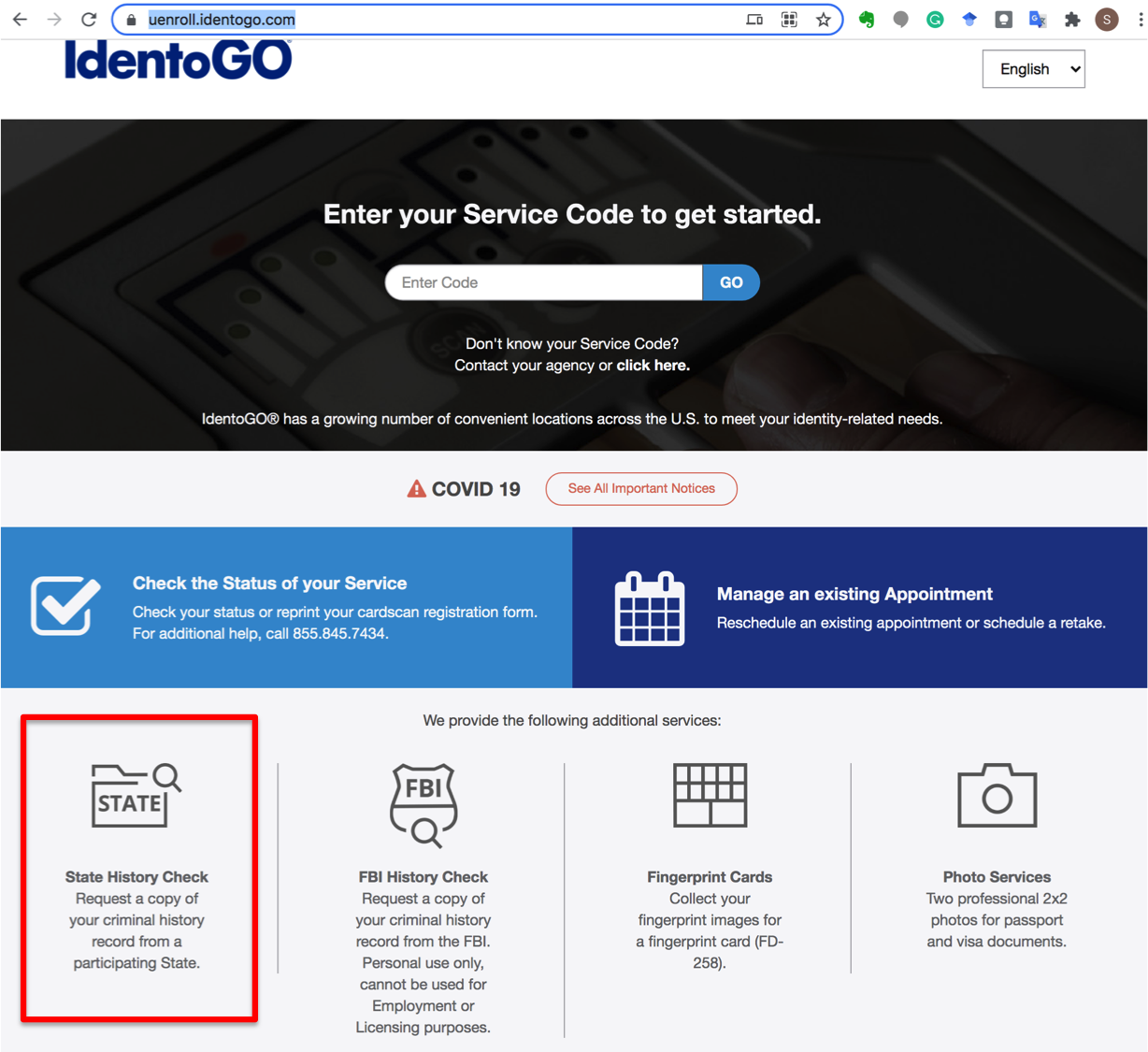 State History Check을 누르고 예약하면 핑거프린트를 해준다 (따로 하지 않아도 된다). 그러면 자동으로 criminal record까지 신청이 된다고 한다.